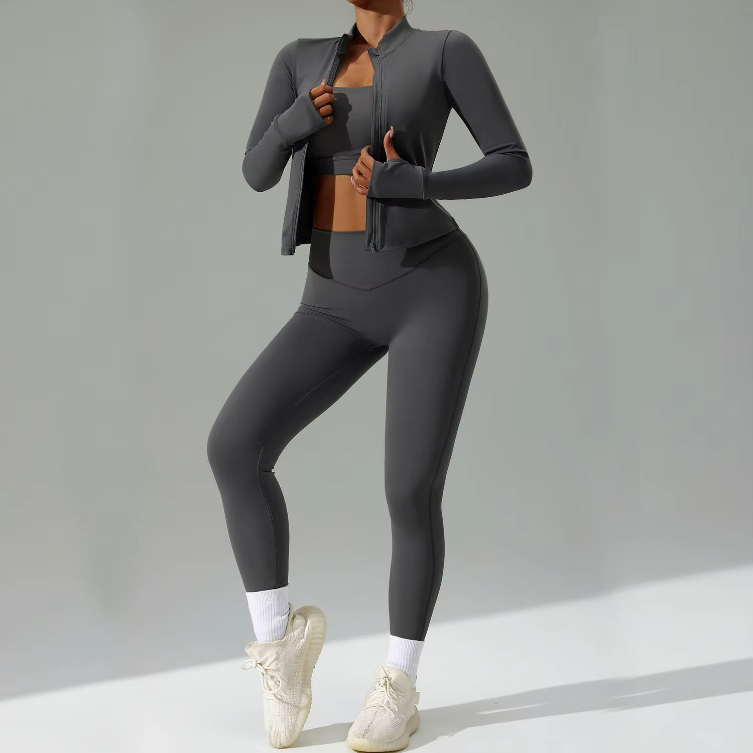 Set sportiv premium, format din jachetă cu fermoar și colanți cu talie înaltă, usor compresiv pentru a accentua talia si a obtine un look flawless.